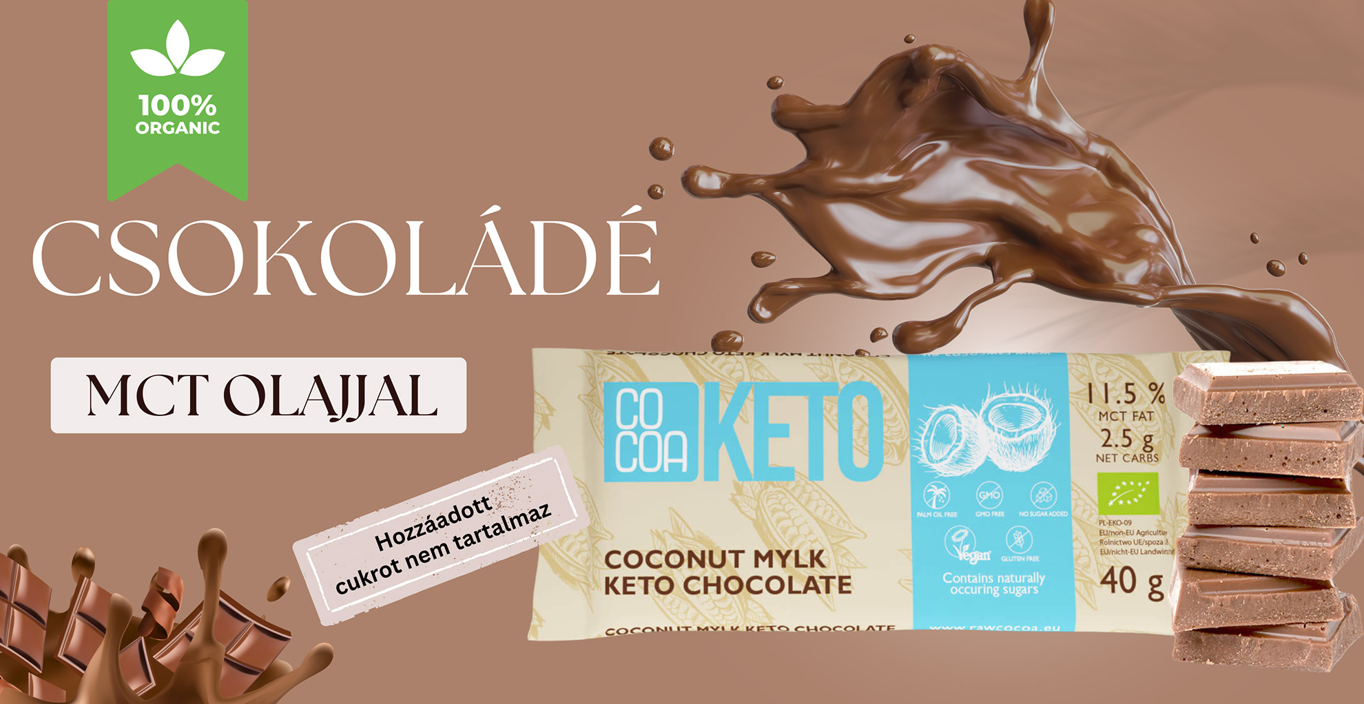 Kókuszból származó, pálmaolaj-mentes MCT-olajjal (C8, C10) készül, hozzáadott cukor nélkül.