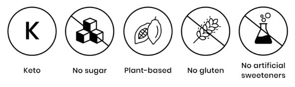 Összetevők: kakaóvaj, növényi eredetű rost (cikória gyökérből), kókusztejpor, édesítőszer (eritritol), kókuszból nyert MCT olajpor (5%) (MCT olaj, akáciagumi rost), bourbon vanília